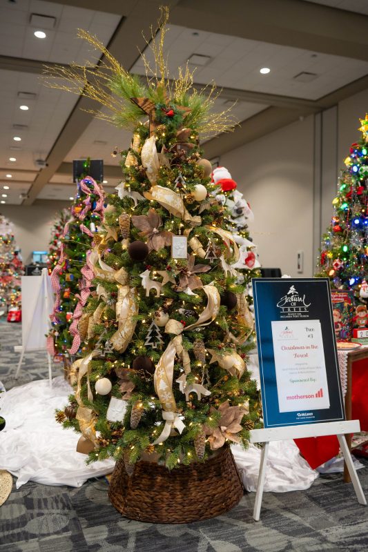 Sponsored by Motherson, this tree has natural beauty and elegance combined. The tree is earthy tones and features the forest with organic elements such as pinecones, natural wood and animals.