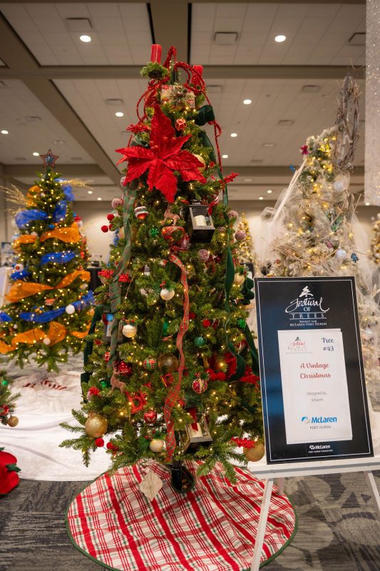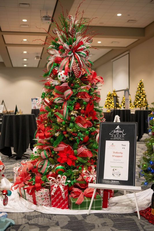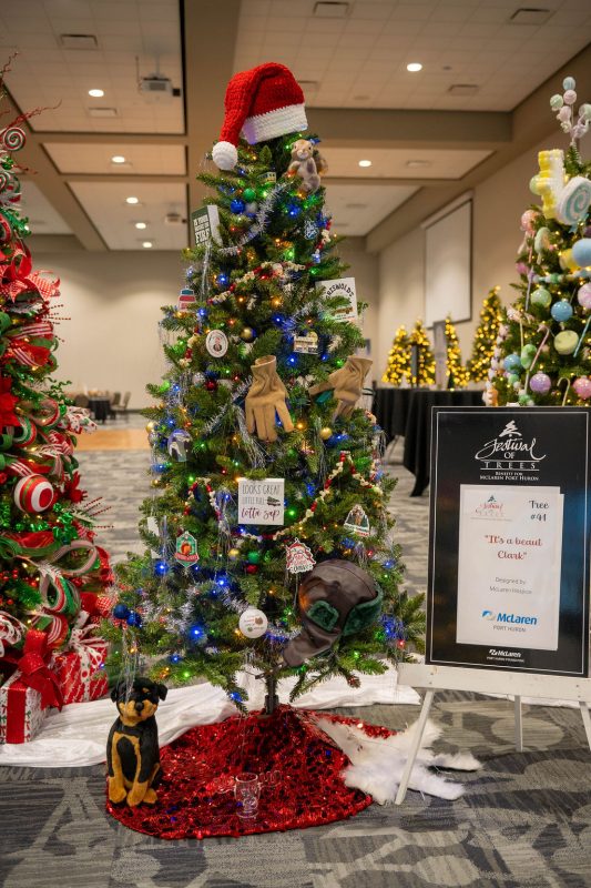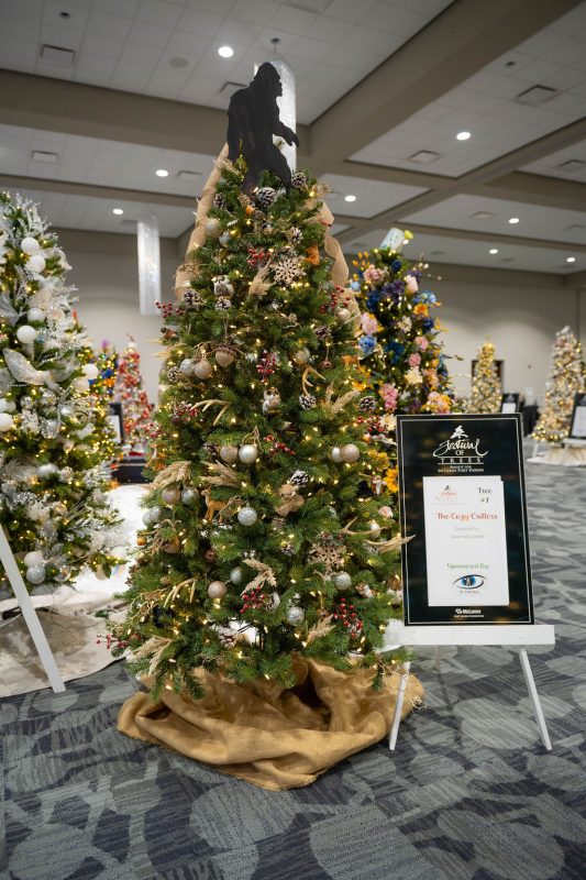 Sponsored by St. Clair Eye, this tree is cozy, warm and festive. It has woodland creatures, natural elements and pops of holiday color.