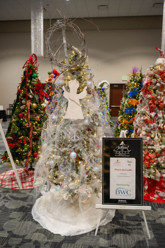 Sponsored by Blue Water Counseling, this tree has lots of peace signs with sparkles and is an all white tree.