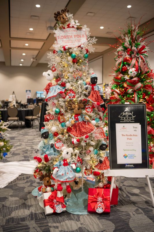 Sponsored by Physician Healthcare Network, P.C., this tree is about pals in the North Pole. Deer, polar bears and penguins. The colors are red, white and aqua. It will be snowy and icy.
